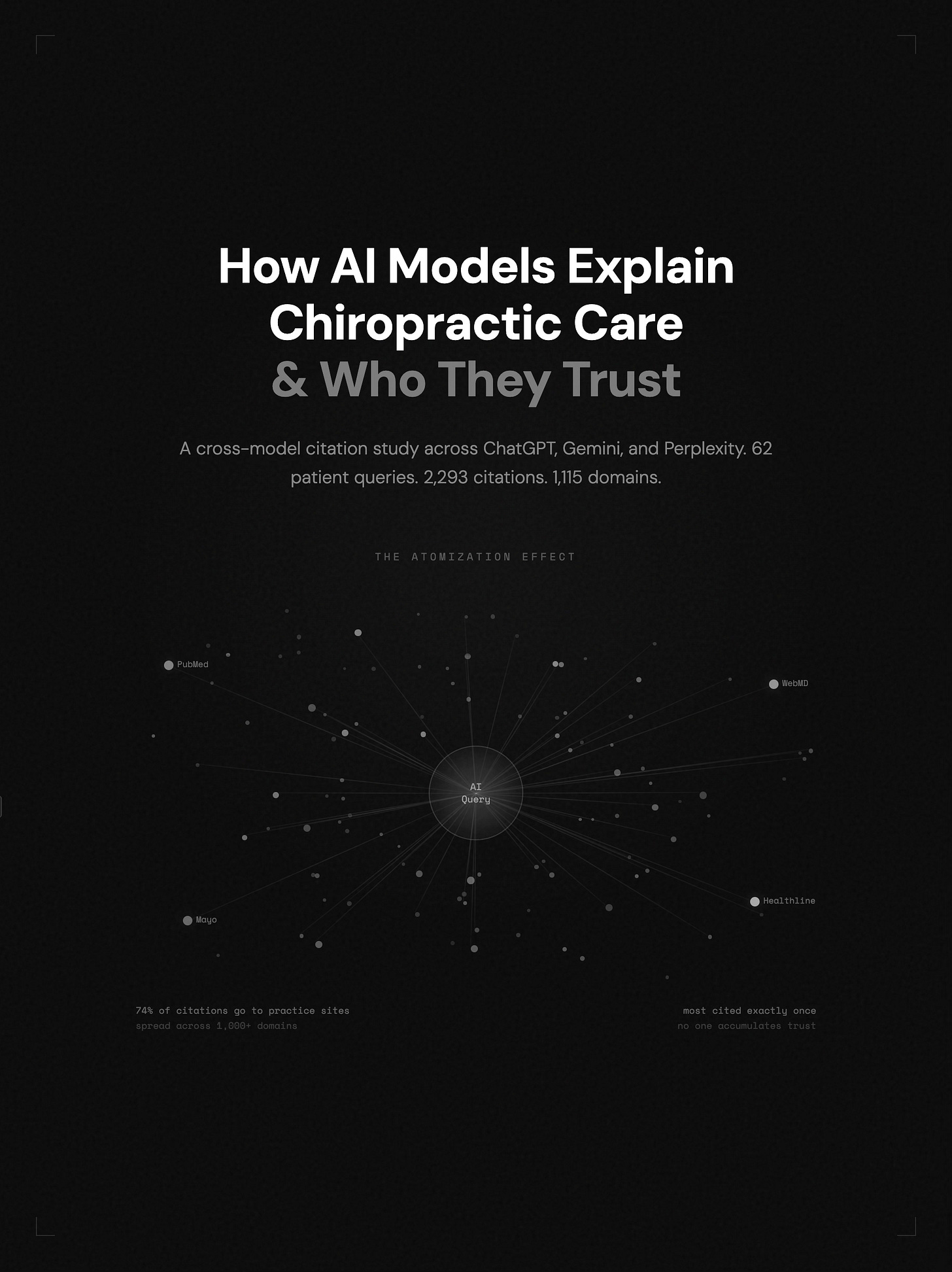 Every finding in this study likely generalizes beyond chiropractic. Physical therapists, dentists, optometrists, mental health counselors — every local healthcare practitioner vertical probably shares the same patterns: atomized citation pools, schema deserts, commodity content, and a Layer 1→3 bridge gap that nobody has filled.